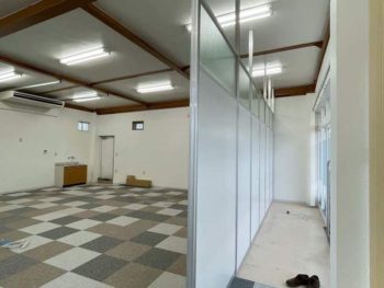 | お客様のご要望 | 休憩室、会議室を店舗の中に作りたい 外の光が入りすぎないようにブラインドつけてほしい。 入口をパーテーションで仕切りたい。 |